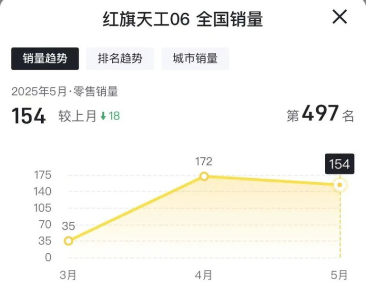 4月份红旗天工06上市,4月不足一个月,销量为172辆,5月是首月整月销量,竟然比4月还低,仅有154辆,新车刚刚上市,销量一般走势是攀升,加上5月还是销量旺季,红旗天工 06还出现销量下滑,实在是看不懂一汽红旗这波操作。