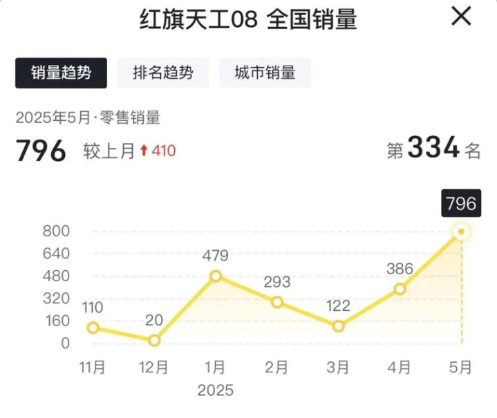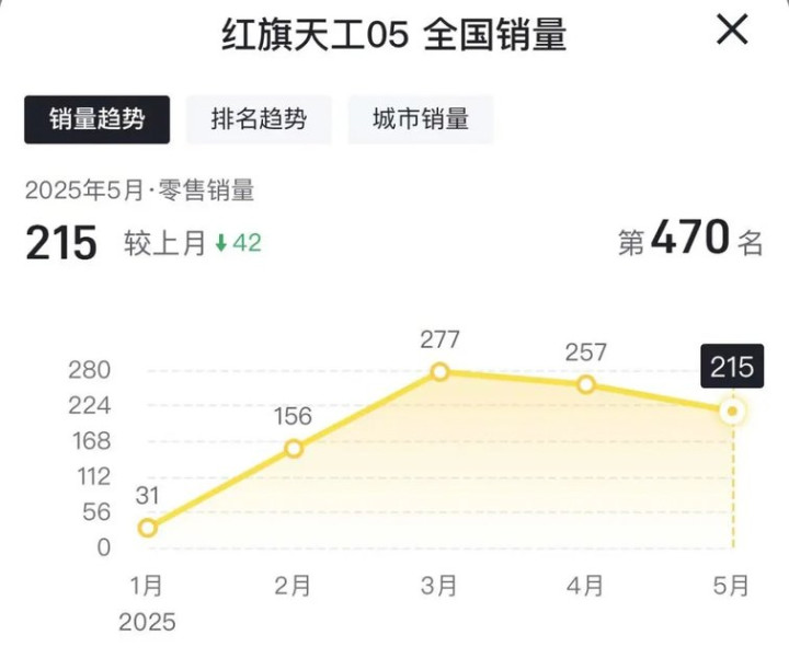 2025年前五个月红旗天工08总计销量为2076辆,一款上市5个月的新车,这个表现不能说差,只能说太差了,毫无存在感。